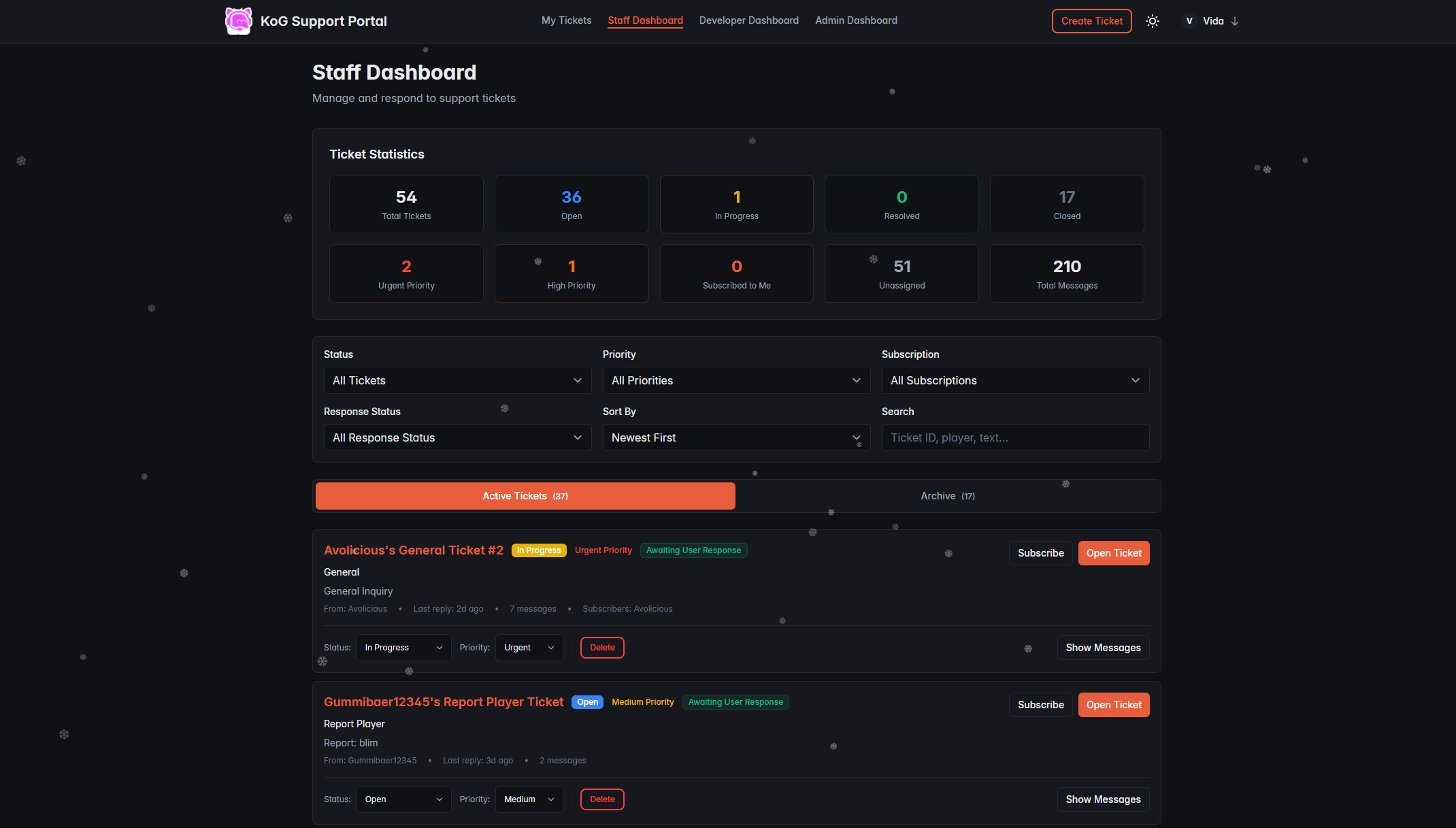 A modern support ticket management system built for the KoG gaming community. Features secure OAuth authentication via KoG's identity provider, real-time ticket updates using Server-Sent Events (SSE), file attachments with MinIO object storage, role-based access control (user/moderator/admin), and comprehensive ticket management capabilities including creation, replies, status tracking, and administrative oversight. The application includes seasonal decorations (like snowflakes), dark mode support, and a responsive mobile-friendly interface.